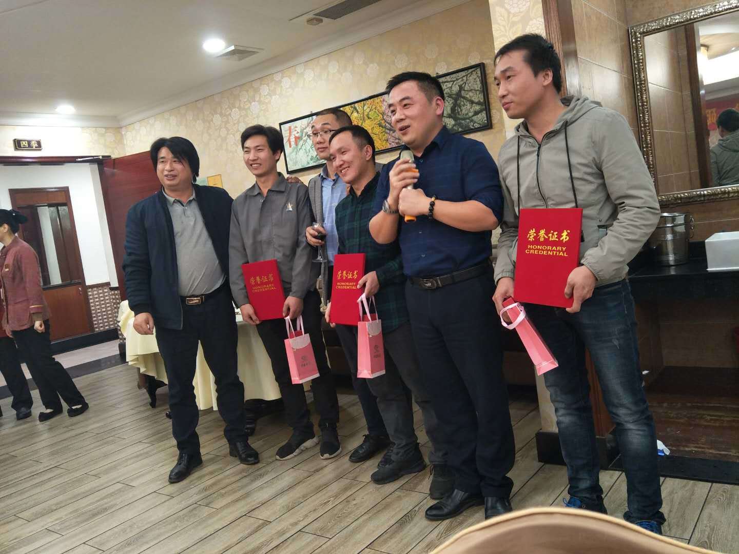 晚宴最后,舒總攜手林總、鄭總一起為研發(fā)部和生產(chǎn)部幾名做出了突出貢獻的員工頒發(fā)了榮譽證書!